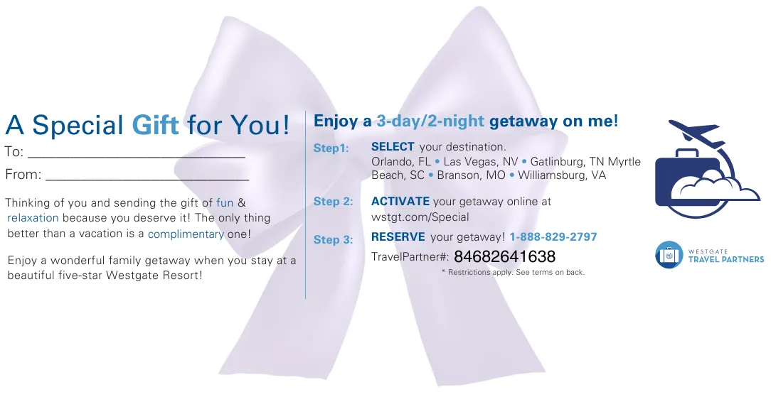 Offer is designed for married or cohabitating couples and single females, with a minimum FICO score of 600 or higher, who reside at least sixty (60) miles from the resort property and who have a minimum annual household income of $50,000.00 USD ($60,000 USD for Las Vegas). Qualified participants are individuals between the ages of 27-70 who must attend a 120-minute discovery tour and sales presentation of Westgate Resorts. If married or cohabitating, both parties must attend presentation together. You may not be eligible for all premiums offered in this promotion. Offer is not available to groups, family reunions (three (3) or more families traveling together), current Westgate Resorts Owners, CFI/Westgate Resorts employees and their immediate families, persons who have toured any Westgate location within the last twelve (12) months or that have participated in a Westgate Resorts’ promotional offer, requiring a tour more than once in a lifetime. One (1) offer per household. Gifts will be awarded upon successful completion of the 120-minute discovery tour and sales presentation. This offer is not directed to residents in any state and does not constitute an offer in which a registration of the timeshare plan is required. The complete offering terms are in an offering plan available from sponsor. Offer expires 12/31/26. You may cancel this agreement without any penalty or obligation within ten (10) calendar days or a specified longer period, after purchase. If you decide to cancel this agreement, you must notify the seller in writing of your intent to cancel. Your notice of cancellation is effective upon the date sent and must be sent to Westgate Resorts, Ltd., at 2801 Old Winter Garden Rd., Ocoee, FL 34761. Any attempt to obtain a waiver of your cancellation right is unlawful.